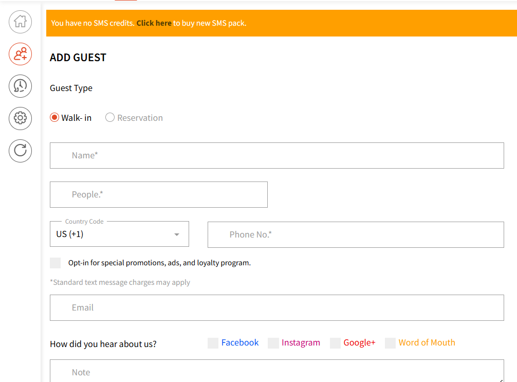 - To add a guest, enter the guest information including name, party size, mobile number, opt-ins, organization reference (where did you heard about us?), notes and click on Add Guest.