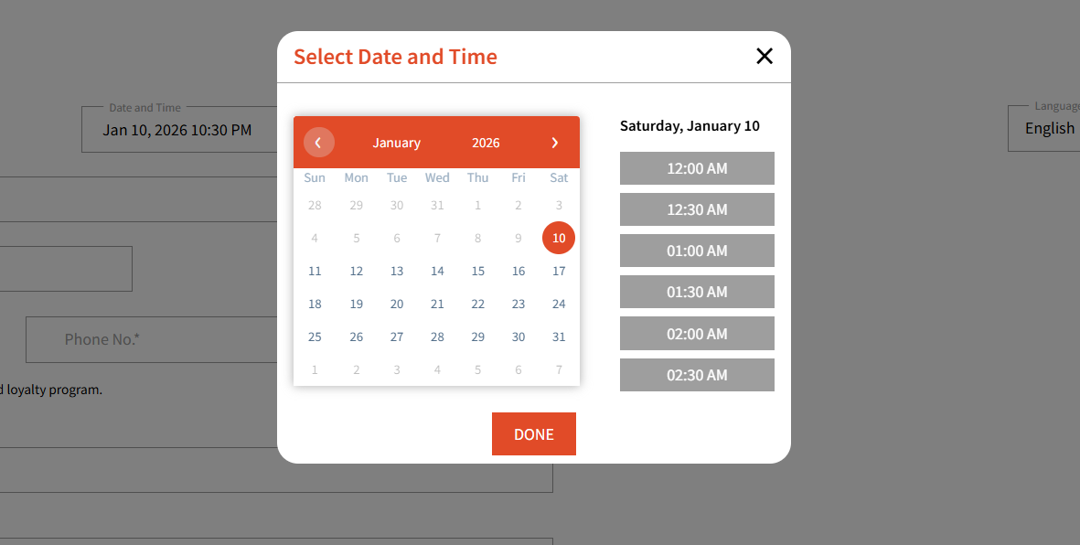 The available slots will show according to the business hours in My Account, including any 'off days' and any 'Off reservation days' from Waitlist settings.