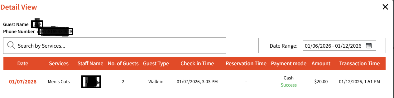 For the following organizations, the guest history view will look like this giving you details about the Staff and Services assigned to the guests: