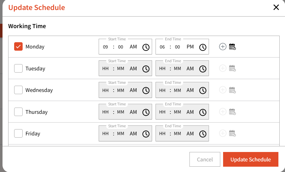 You can also select the Calendar icon located at the end of the line to apply the same time to all the other days of the week.