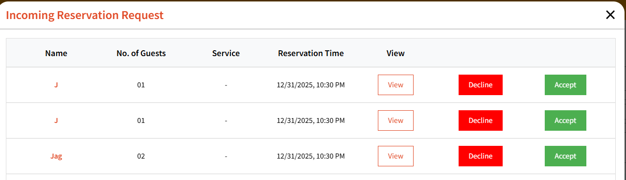 Any incoming reservation requests will be shown on the dashboard and a bell will ring: