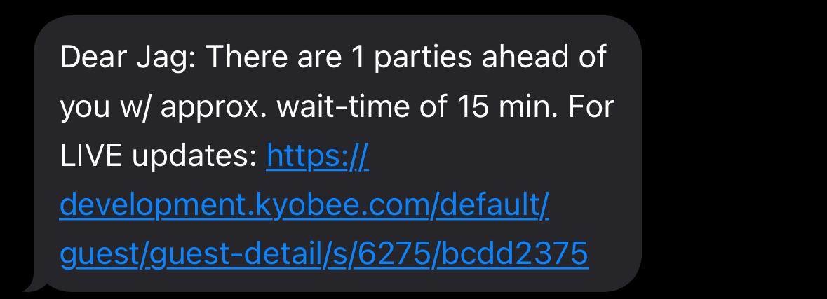 - For Walk-in guests, the following text template is sent. There is also a URL sent within the text that the guest can access using their phone to get live updates.