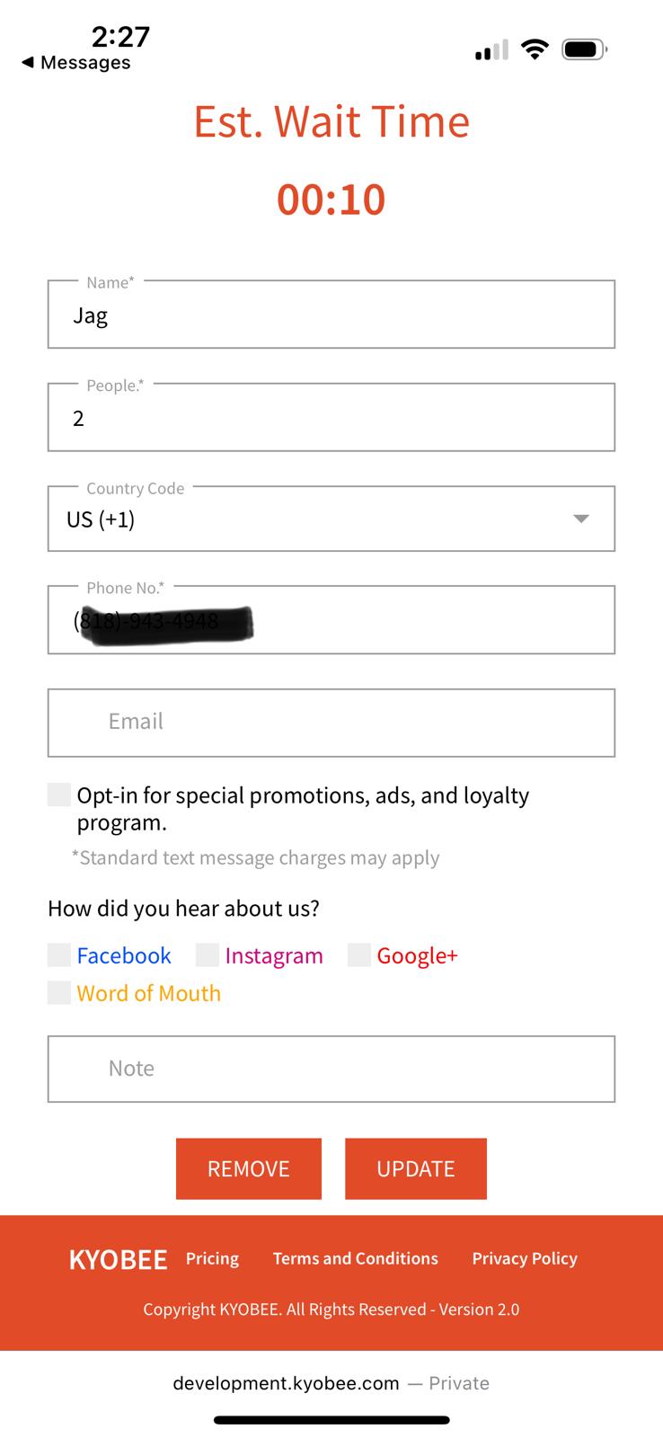 Clicking the link shows the user the estimated wait time along with their walk-in details. The guests can make modifications to their appointments including updating and removing their appointment.
