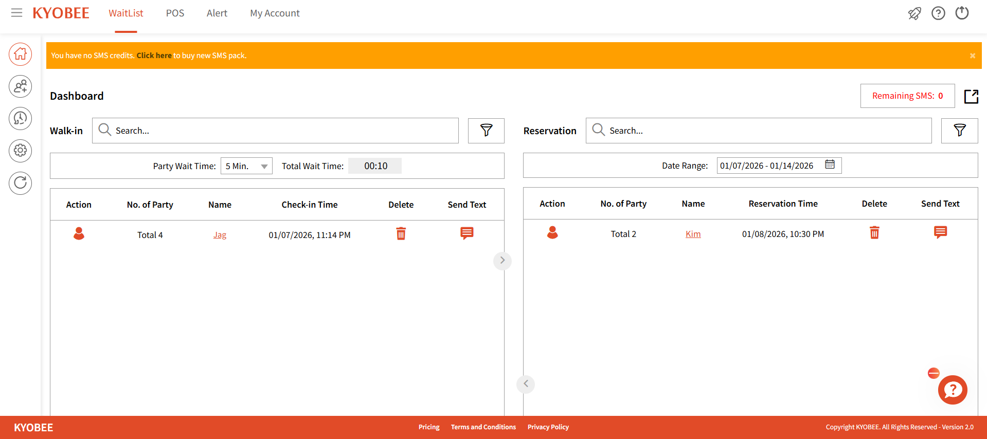 A Send Text option with pre-defined templates is also available, allowing you to send text messages to your guests. Please note that from the moment a guest is added until they are seated, Kyobee automatically sends notifications on your behalf.