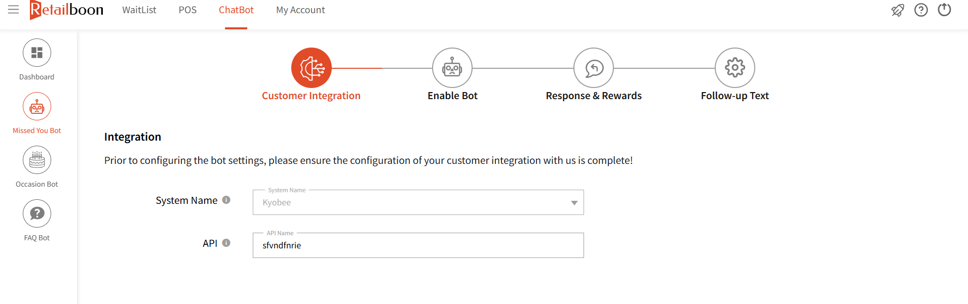 - User can select the system they are using: “Open Table” “Clover” “Square” “Retailboon” Except for Retailboon, if the user picks any of the other fields, they can then enter their API key and click the "Next" button to be redirected to the Enable bot screen.