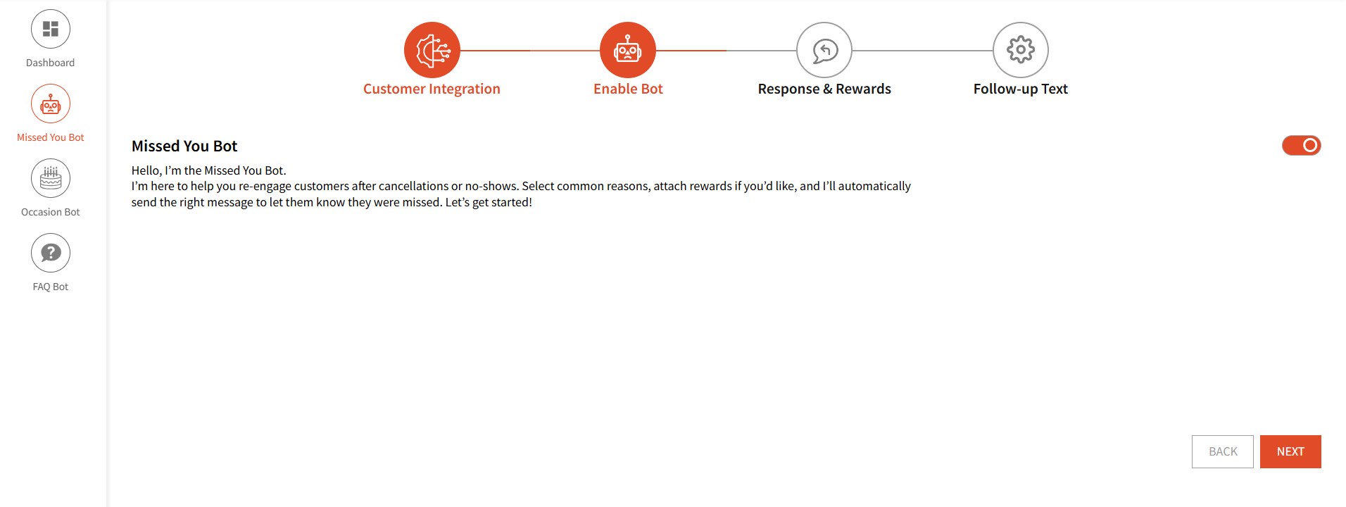 - Clicking on a particular day and seeing the red button activates that day. For example, if 5 is selected in the engagement follow up text, this means that the customer will be sent a text message with the Missed You Bot link 5 days post that customer cancelled / did not show up to their waitlist / reservation.