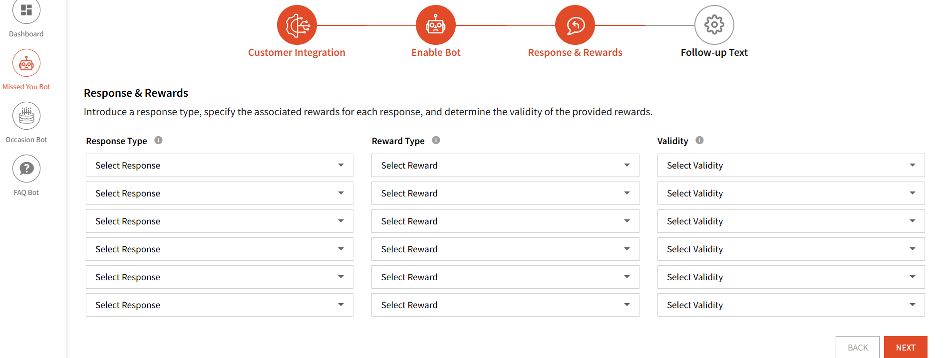 - After all dropdown data has been selected, user can click on " Next " button, it will redirect to the Follow-up text screen and "Back" button will redirect to the Enable Bot Screen.