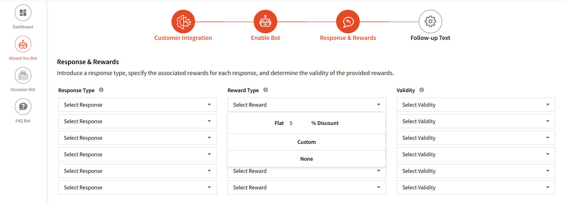 Selecting a reward for a particular response means that the customer who selects that response while interacting with the Missed You Bot will get that reward.