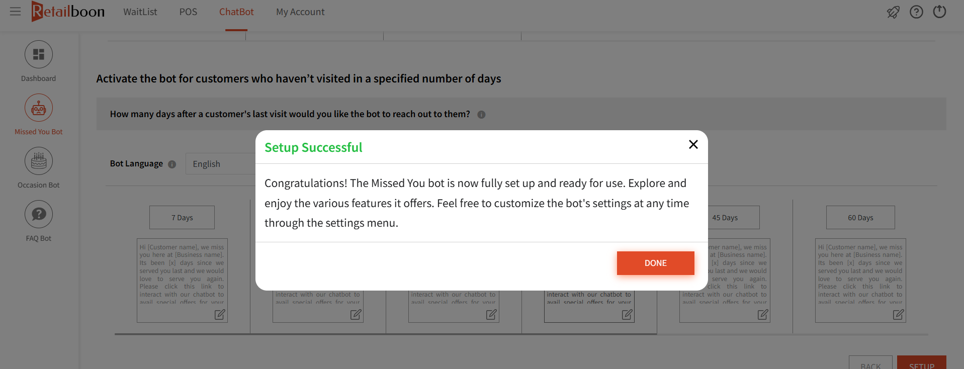 Not just that, with our new Missed You Bot, we also reach out to customers who have not visited your business in certain no. of days. They are also rewarded for coming back to your business.