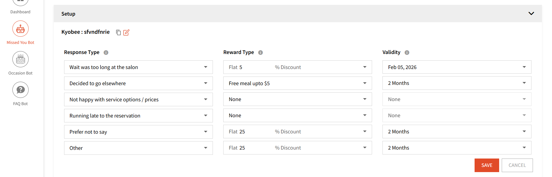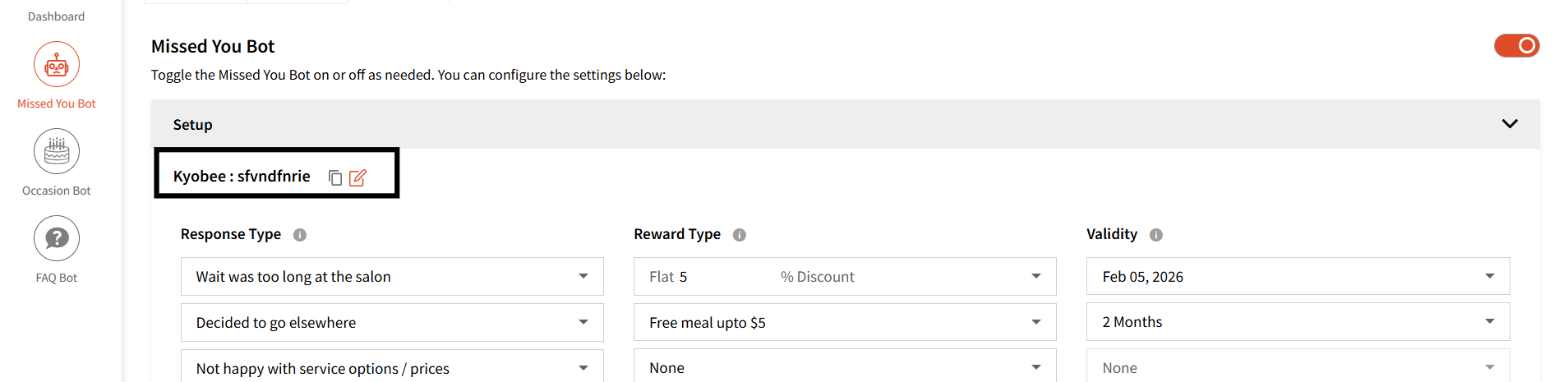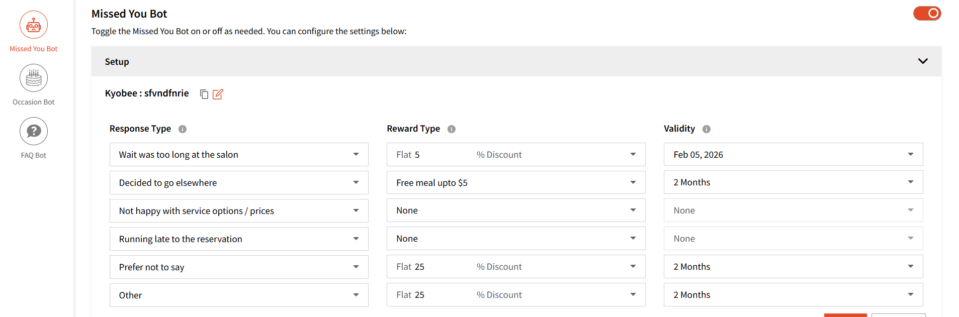 User can also Activate the bot to reach out to customers who have not visited in a certain no. of days.