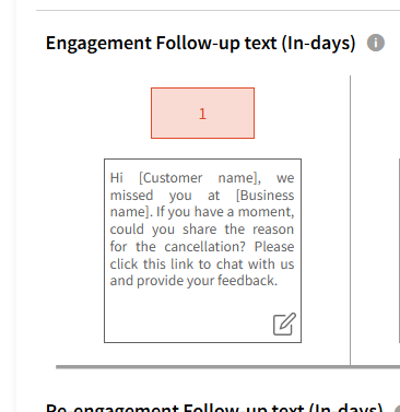 - User should be able to see the set Re-engagement Follow-up text (in days) and change it by clicking on the edit icon, and by clicking on the Save button, new data should be saved.