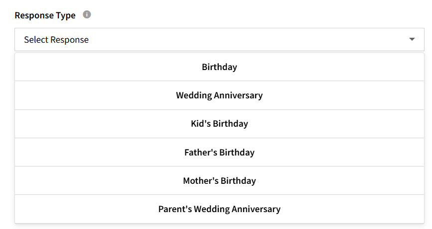 - User can click on any of the "Response Type" dropdown options; the user can see the below options: 1. Birthday 2.Wedding Anniversary 3.Kid's Birthday 4. Father's Birthday 5. Mother 's birthday 6.Parent's wedding Anniversary