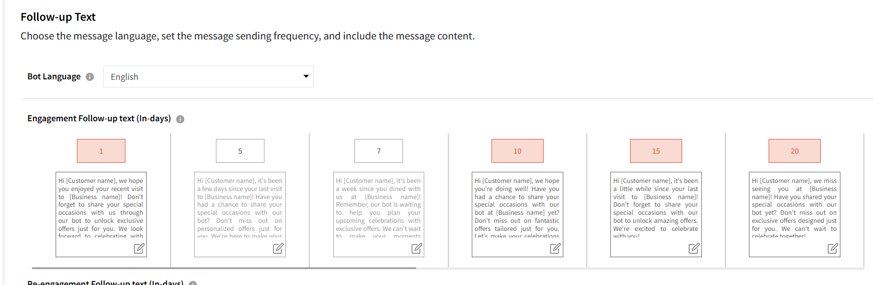 - User can see the Bot language, Engagement Follow-up text (In-days), & Re-engagement Follow-up text (In-days)