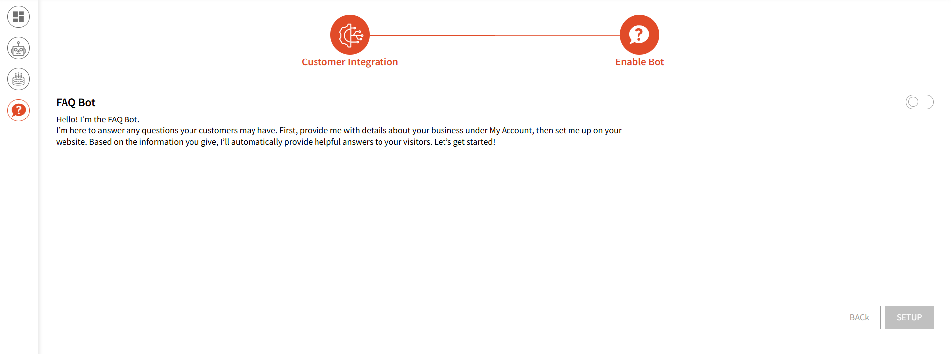 - User can enable the bot by clicking on the "Toggle Switch" and then click the " Setup " button and back to indirect to the Integration screen
