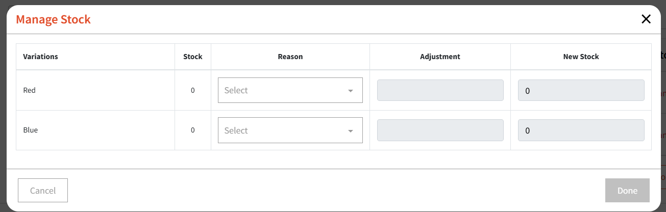 In this case, you can click 'Manage Stock' which will allow you to adjust your stock levels for different options: