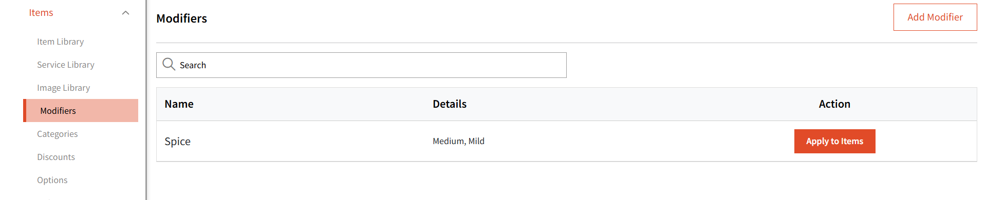 Once the modifier group is created, you can apply it to an item you wish to attach it with using the 'Apply to Items' button.