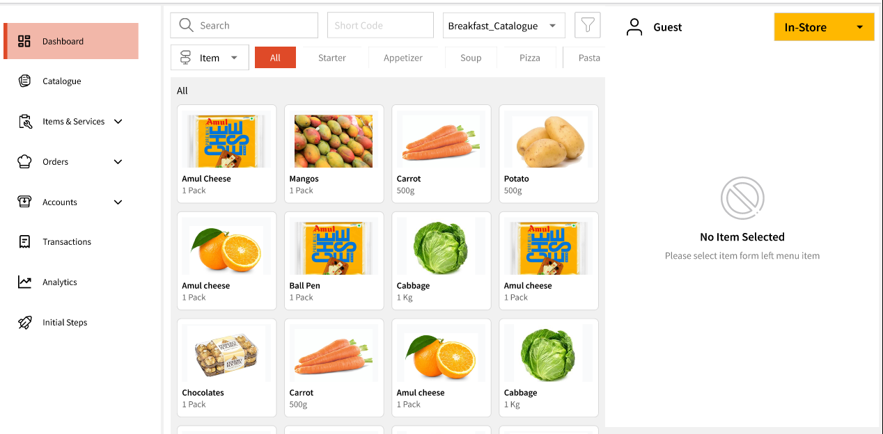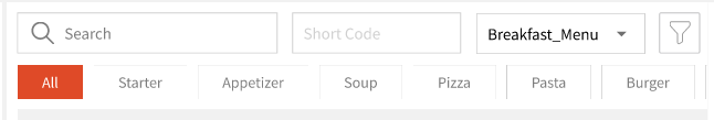 You can search for items using the name or even the short code configured at the time of creating the item. You can even change the Menu selected and filter items by categories: