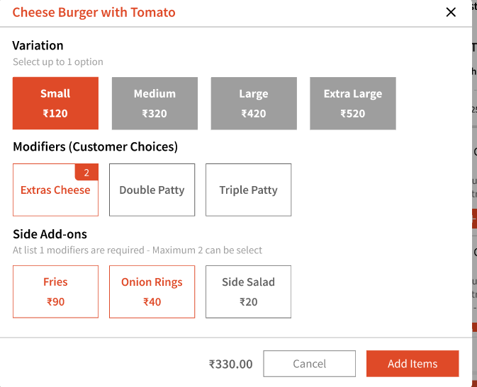Clicking an item will let you pick from its configured modifiers and options: