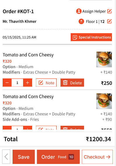 For 'Dine-In' orders, you can assign a helper to the table, update table numbers and even add guest details to the table.