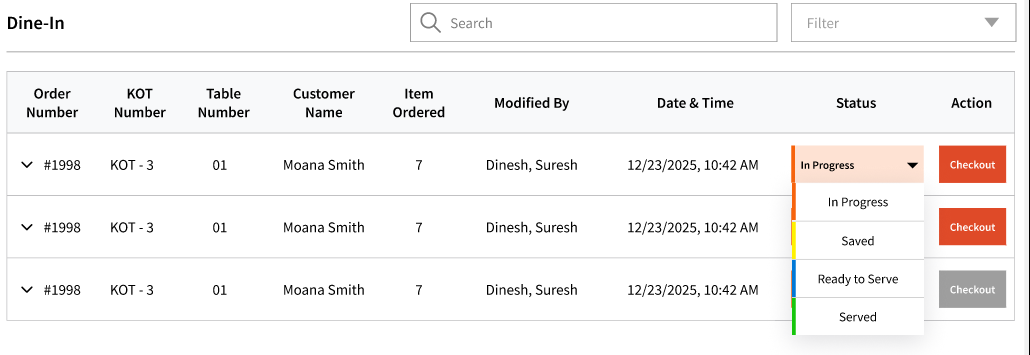 For 'Dine-In' or 'ASAP' orders, once you put it in, the order status changes to 'In Progress'. After that, once the order is ready, you can manually update the status in the