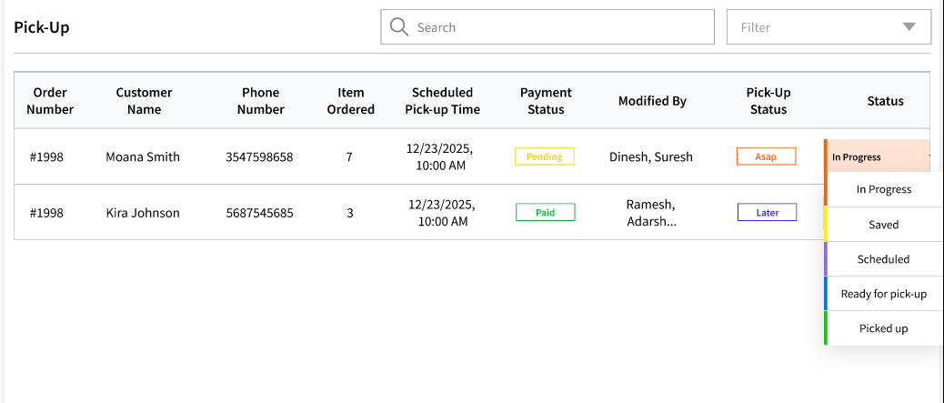 Note: For 'Later' orders, the status will show as 'Scheduled'. For example, if I add an order to be picked up at 5:00PM later today, it will show as 'Scheduled'. Once the order is being worked on, you can manually change it to 'In Progress'.