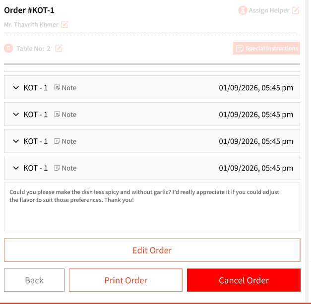 As a quick reminder, KOTs are parts of orders. For example, if the dining in party ordered appetizers first, you can submit those as KOT#1 under Order#1. Once they are ready to order mains, you can click on the same order and then submit another KOT that will get attached to the same order.