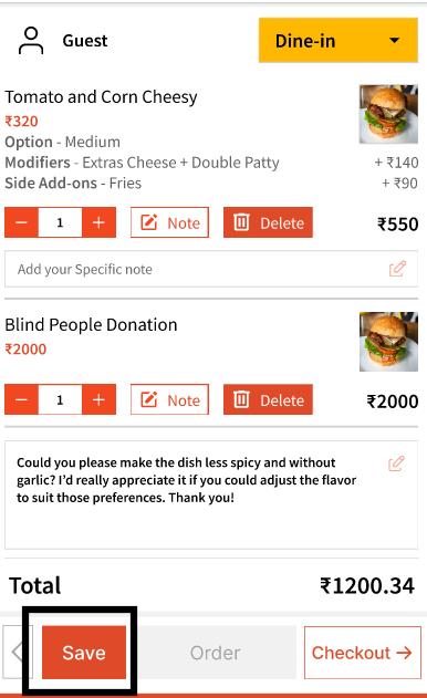 You can even 'Save' orders if you are not ready to add it but want to start working on it. This saves the order as a 'Draft' and the status will show as 'Saved'. For example, if you start a 'Dine-in' order, you can click 'Save' and this will add the order to 'Dine-in' but keep the status as 'Saved'.