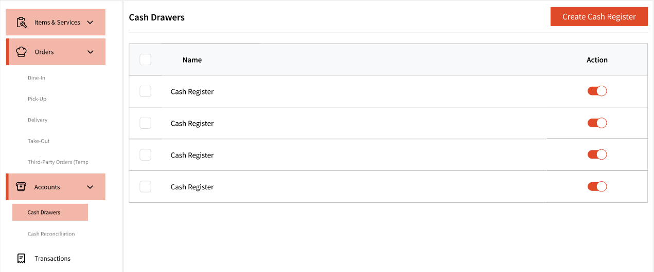 Hitting 'Create Cash Register' will allow you to add a new cash drawer to the system.