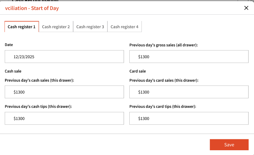 Upon start of each day, the admin will be prompted to complete the start of day form for each of the cash drawer: