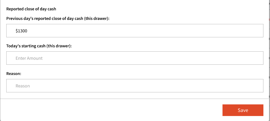 If for any reason, the starting day cash does not match the previous day's cash, the user will be required to enter the reason: