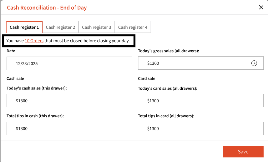 All orders in the system must be closed before an admin can complete the End of Day form. If there are any pending orders, an alert will continue to appear on the End of Day form.