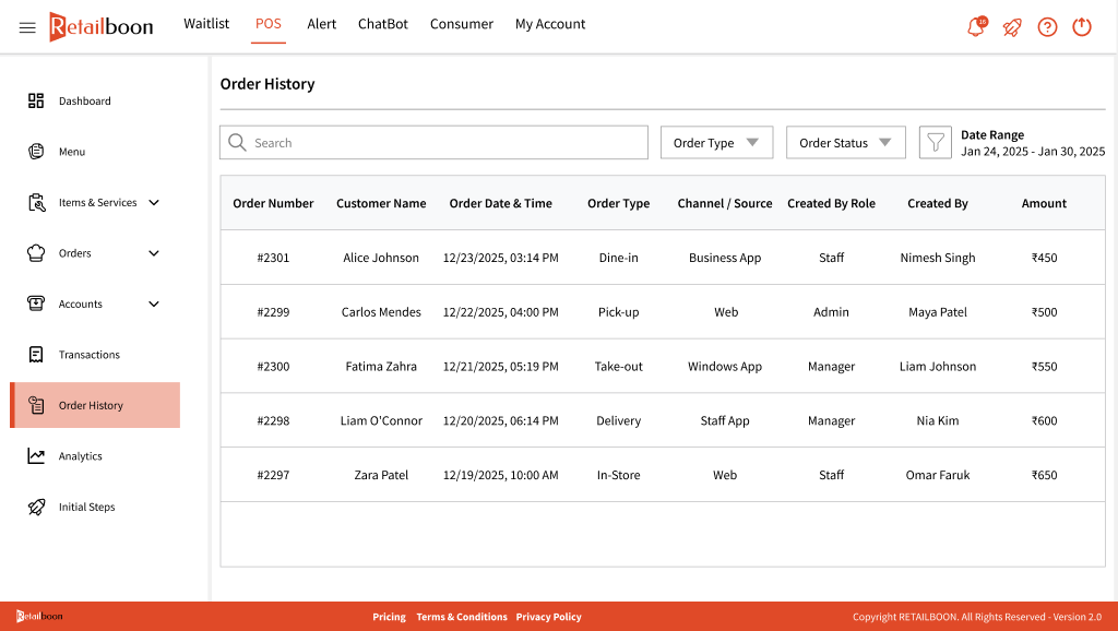 Along with that, you can also view the source of the order which means the source from where the order was put it i.e. Business app, Web, Windows app, or Staff app.