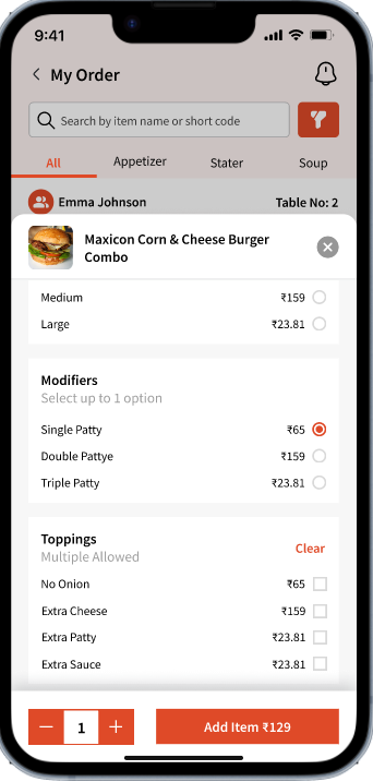 Once you are ready to add an item to the order, just click 'Add' which will let you select any modifiers, options and also add quantity.