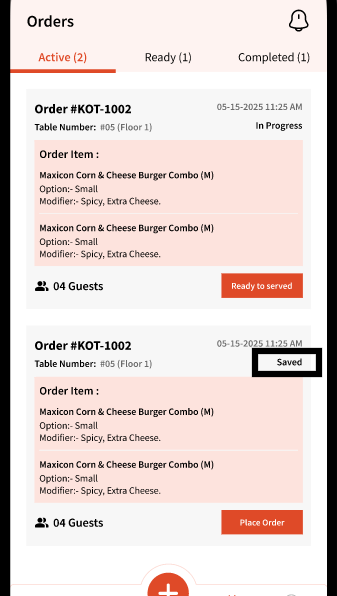 Before placing the order, the user can hit 'Save' that will move this order to 'Orders' and show the status as 'Saved'.