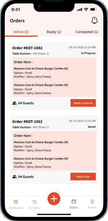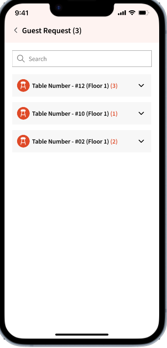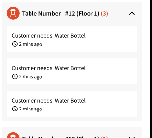 This allows users to view table numbers, the number of guests, and the floor where each table is located. Clicking a table expands the view to show submitted requests and how long ago they were added.
